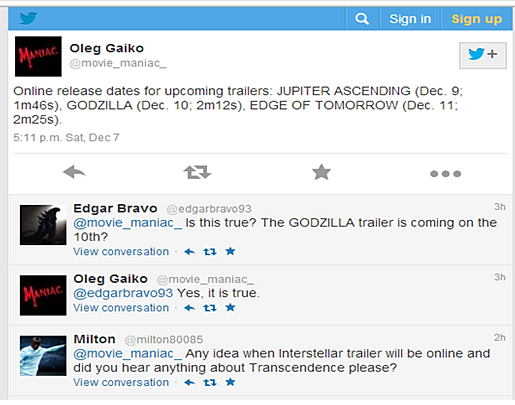 It was reported today on Godzilla Fans Universe G that the Godzilla 2014 trailer may be released online on Dec. 10, 3 days earlier than expected, attached to The Hobbit: The Desolation of Smaug which opens worldwide on Friday Dec. 13. The news was tweeted by @movie_maniac_ on twitter. It's unknown how reliable this info is, but we may see the trailer in just a couple of days. Here's a pic of the tweet and stay tuned on this fansite for the new trailer.